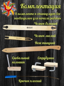 А именно: ценовые палочки; малый и большой челнок; нож для прибивания; сновальный колышек, струбцины; крючок специальный заправочный; стенд-подставка; инструкция.