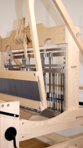 - в ремизных рамах используются стальные профилированные галева на свободном ходу (это значительно упрощает заправку станка, галева имеют высокий запас прочности, т.к. используются в том числе и на промышленных ткацких станках). Галева удобно заправлять, т.к. они имеют широкий глазок с небольшим поворотом по оси, для более удобной заправки. Галева легко двигаются вдоль ремизной рамы и легко выбираются.
